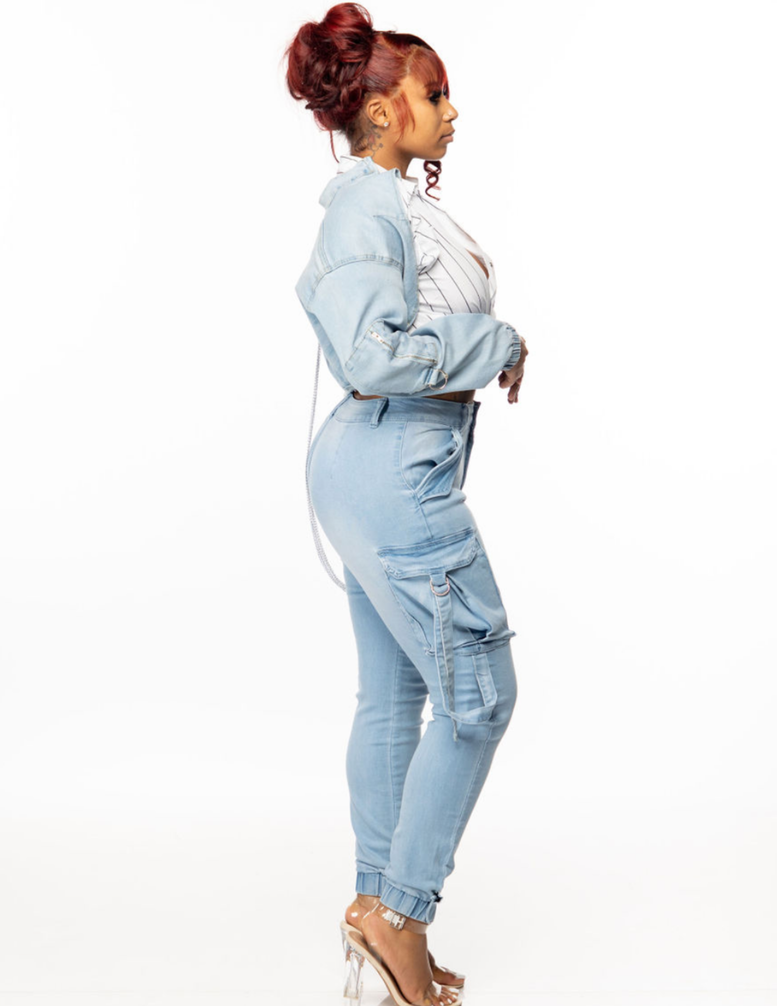 SNOB Alexa DENIM Cargo High Waist Stretchy Jean Set- Light Wash