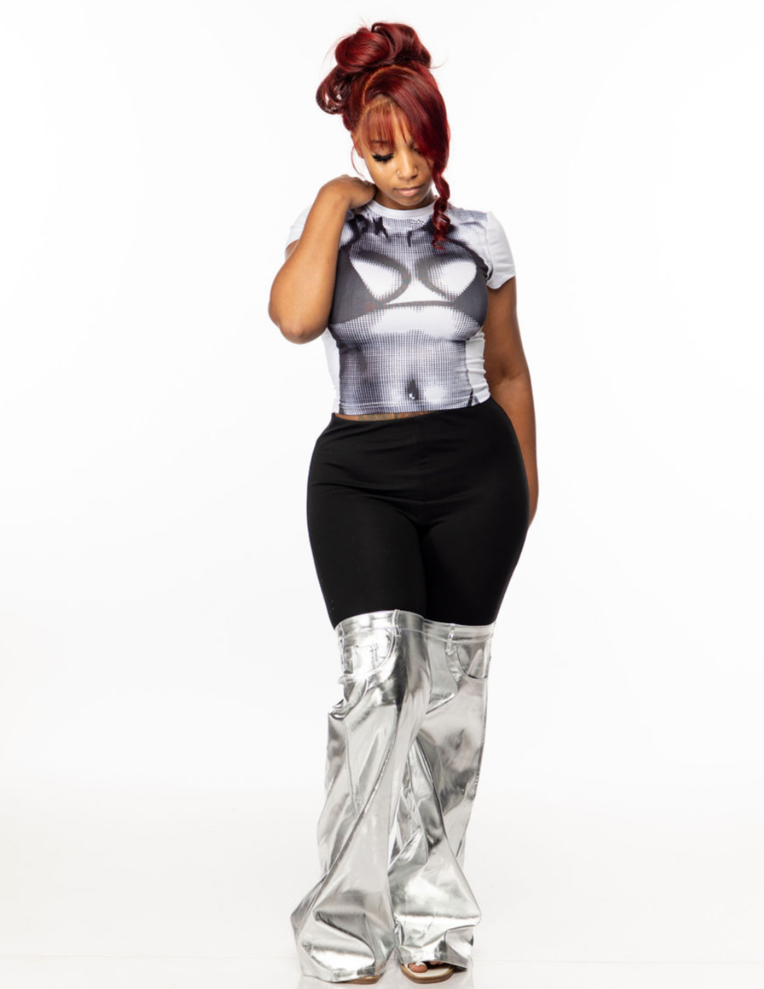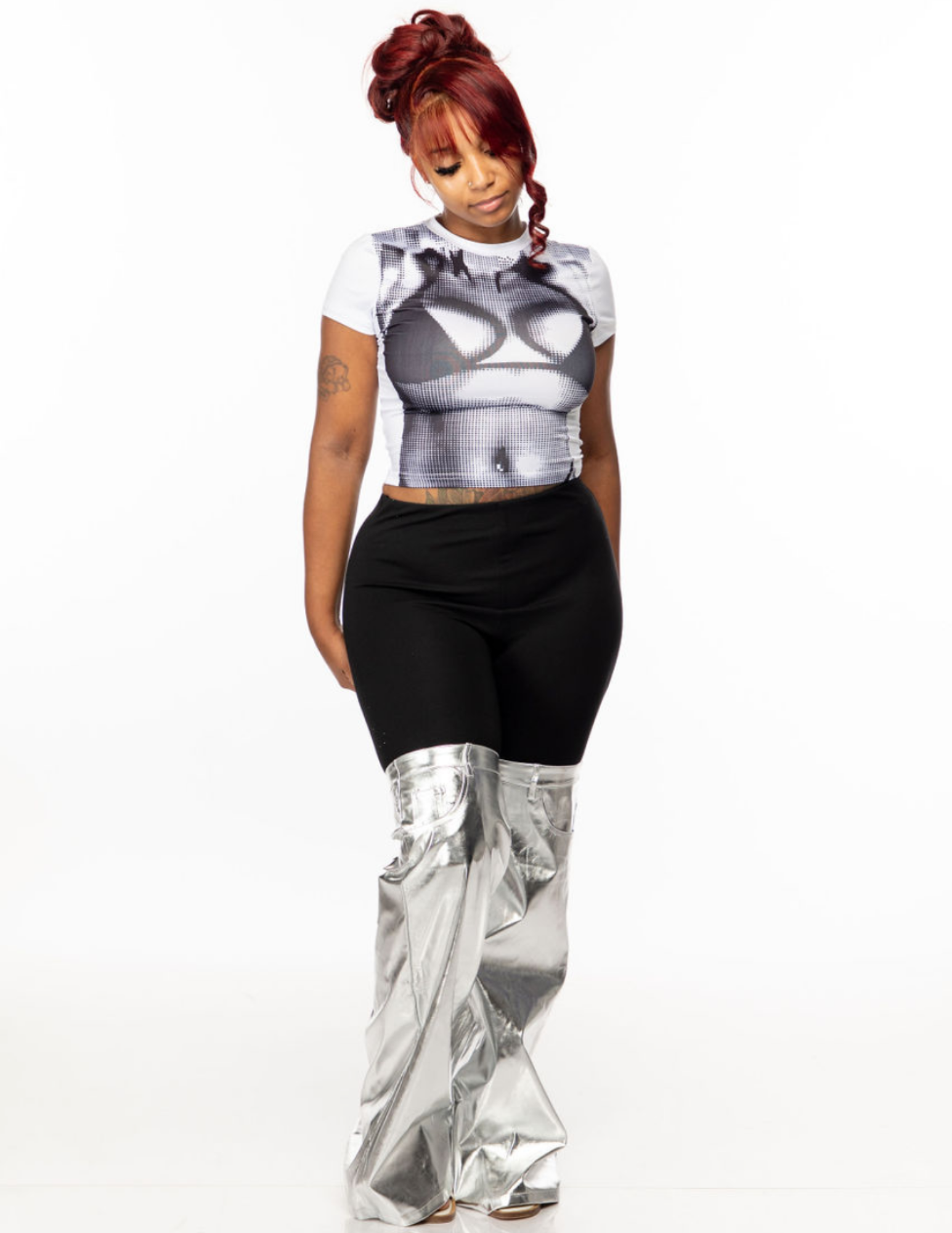 My space pants are stretch pants at the top with a stretch and the bottom is silver. Fits true to size. Can be paired with flats or heels.